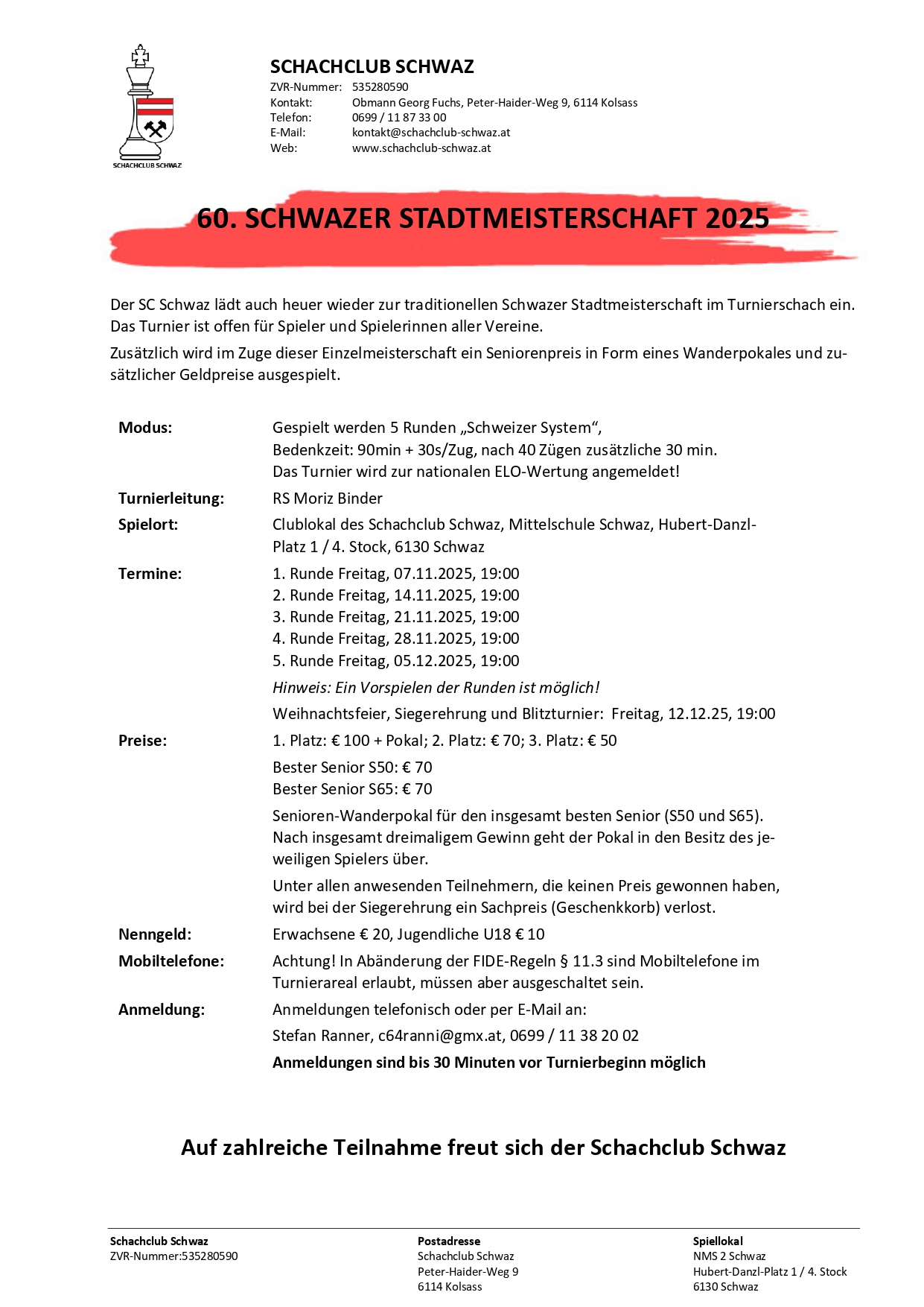 Der Schachclub Schwaz lädt herzlich zur traditionellen Schwazer Stadtmeisterschaft ein. Das Turnier startet bereits in einer Woche mit der 1. Runde am Freitag, dem 7. November 2025, um 19:00 Uhr im Klublokal des SC Schwaz (Mittelschule Schwaz, Hubert-Danzl-Platz 1/4. Stock, 6130 Schwaz).